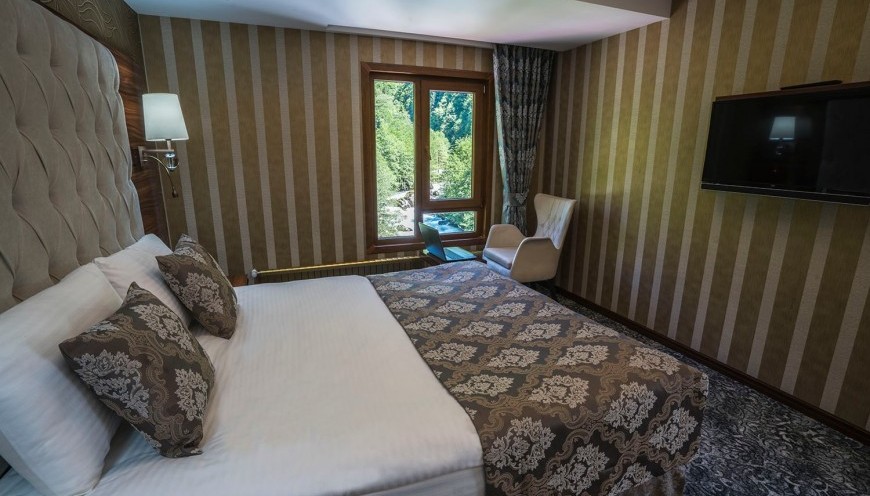 مواصفات الغرفة : تحتوي الغرفة على سرير مزدوج كبير مع إطلالات خلابة على الجبال المحيطة. مجهزة بجميع وسائل الراحة الأساسية مثل التلفاز، الميني بار، وخدمة الواي فاي.